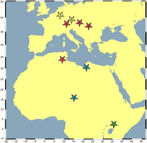 Die übrigen europäischen Fundorte, Hammerschmiede (4), Götzendorf (5) und Brusturi (6) datieren, ebenso wie die Funde aus Tunesien (7), in das frühe Obere Miozän, was einem Alter von etwa 11,6–9,8 Ma entspricht. Die beiden weiteren afrikanischen Funde aus Libyen (8) und dem Tschad (9) lassen sich mit Altern von 7–6 Ma hingegen dem Messinium, der obersten Stufe des Miozäns, zuordnen.[2]