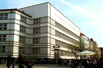 In einem deutlichen Kontrast zu der die Schule umgebenden Architektur der Gründerzeit[5] entstand auf einem Sockel aus Naturstein ein viergeschossiger, verputzter Baukörper mit einem überhöhten Dachgeschoss im Stil des Neuen Bauens. Der Eingang zur Schule wurde aus der Mittelachse herausgenommen, wird jedoch betont durch die waagerecht und über Eck geführte Bänderung aus Travertin. Die starke horizontale Streckung der Fassade[3] des ansonsten nahezu schmucklosen Baus wird[2] mit ihren Fensterbändern und umlaufenden Gesimsen[3] unter dem flach geneigten Walmdach noch besonders betont.[2]