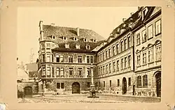 Die als von Amman geborene Anna Barbara von Stetten heiratete im Alter von zwanzig Jahren 1774 den Juristen Johann Ferdinand von Stetten, der nur vier Jahre später verstarb und seiner Frau ein großzügiges Erbe hinterließ.[7] 1803 verfasste Anna Barbara von Stetten ihr Testament, in dem sie die Gründung einer „höheren Schule für Mädchen“, eines Pensionates und einer Aussteuerungsanstalt[8] verfügte, die 1806 – ein Jahr nach ihrem Tod am 19. Februar 1805 – erfolgte: Am damaligen Annaplatz (heute Martin-Luther-Platz, Hausnummer 3) wurde eine Schule mit 21 Schülerinnen in zwei Klassen eröffnet. 1809 wurde die Schule vom bayerischen Staat als „Anstalt für höhere weibliche Bildung“ anerkannt.[9] Das Bildungskonzept der Institution orientierte sich am Bildungsideal der Philanthropen, abgesehen von einem leichten pietistischen Einfluß.[10] Dabei nahm die Erziehung zu Sittlichkeit und Fleiß breiten Raum ein.[11] Allgemein war der Unterricht ganz auf die Vorbereitung der Mädchen hinsichtlich ihrer dreifachen Bestimmung, nämlich Hausfrau, Ehefrau, Mutter, ausgerichtet. Die Fächer Tanzen, Zeichnen, Malen. Sticken und Französisch als Momente der eleganten Bildung sollten nicht allgemein gelehrt werden. Im Fächerkanon dominierten Handarbeiten und Hauswirtschaft: Bei einem ganztägigen Unterricht waren nur 1,5 Stunden für die Fächergruppe Religion, Sittenlehre, Rechtschreibung, Muttersprache, Geographie, Naturgeschichte und Physik vorgesehen sowie eine Stunde zusätzlich für Rechnen und Schreiben in der unteren der beiden Klassen.[12]