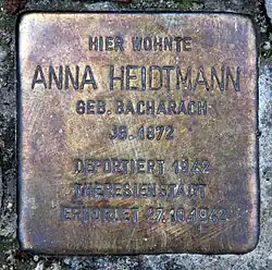 Anna Heidtmann-Bacharach wurde 1942 ins KZ Theresienstadt deportiert. Am 11. September begann der Transport mit der Nr. I/64 vom Sammellager Große Hamburger Straße 26 zum Anhalter Bahnhof, wo ein Waggon an einen fahrplanmäßigen Personenzug angehängt wurde, der über Dresden nach Bauschowitz fuhr (heute Tschechien). Vom Bahnhof Bauschowitz führten die letzten drei Kilometer zu Fuß in das KZ Theresienstadt.[4]