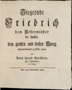 Anna Louisa Karsch, geborene Dürbach, genannt die Karschin (* 1. Dezember 1722 in Hammer, in der Nähe von Schwiebus; † 12. Oktober 1791 in Berlin), war eine deutsche Dichterin. Neben Sophie von La Roche gilt sie als erste finanziell unabhängige Berufsschriftstellerin in Deutschland.[1] Sie war die Mutter der Dichterin Caroline Louise von Klencke und die Großmutter der Dichterin Helmina von Chézy.