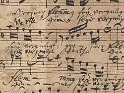 Ausschnitt aus der Sopranstimme der Kantate O angenehme Melodei (BWV 210). Die zwei Textfassungen trug Johann Sebastian Bach ein, die Noten wurden von Anna Magdalena Bach geschrieben.