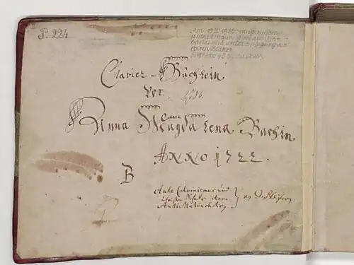 Clavier-Büchlein vor Anna Magdalena Bach Anno 1722. In die Innenseite des vorderen Deckels trug Anna Magdalena Bach den Titel ein.