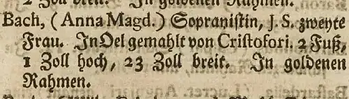 Eintrag im Nachlassverzeichnis von Carl Philipp Emanuel Bach (1714–1788), dem Stiefsohn von Anna Magdalena Bach. Dieses Gemälde ist verschollen. Es gibt heute keine Darstellung mehr von ihr, die als authentisch angesehen werden kann.[1]
