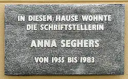 1947 verließ Seghers Mexiko und kehrte nach Berlin zurück,[8] wo sie anfangs als Mitglied der Sozialistischen Einheitspartei Deutschlands in West-Berlin lebte. Auf dem Ersten Deutschen Schriftstellerkongress im Oktober 1947 hielt sie eine viel beachtete Rede über das Exil und den Freiheitsbegriff. In diesem Jahr wurde ihr der Georg-Büchner-Preis verliehen. 1950 zog sie nach Ost-Berlin und wurde zum Mitglied des Weltfriedensrates und zum Gründungsmitglied der Deutschen Akademie der Künste berufen. Im Jahr 1951 erhielt sie den Nationalpreis der DDR und unternahm eine Reise in die Volksrepublik China. 1952 wurde sie Präsidentin des Schriftstellerverbandes der DDR und blieb es bis 1978. 1955 zogen Anna Seghers und ihr Mann in die Volkswohlstraße 81 (seit 1984 Anna-Seghers-Straße[9]) in Berlin-Adlershof, wo sie bis zu ihrem Tod wohnten. Seit dem Ende des 20. Jahrhunderts befindet sich in der Wohnung das Anna-Seghers-Museum zu Leben und Werk der Autorin.
