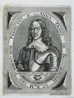 - ↑ a b c d e Antonio Schmidt-Brentano: François-Anne de Bassompierre In: Die kaiserlichen Generale. 1618–1655. Ein biographisches Lexikon. Österreichisches Staatsarchiv, Wien 2022. S. 46ff.