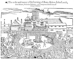 Anne Askew wurde am 16. Juli 1546 zusammen mit drei weiteren Protestanten, John Lassens, John Hadlam und John Hensley (nicht jedoch mit den gelegentlich genannten Nicholas Belenian und John Adams),[3][4] als Ketzerin auf dem Scheiterhaufen verbrannt. Da sie nach der Folter weder gehen noch stehen konnte, wurde sie auf einem Stuhl auf dem Scheiterhaufen festgebunden. Um ihr Leiden abzukürzen, wurde ihr ein Lederbeutel mit Sprengpulver umgehängt.