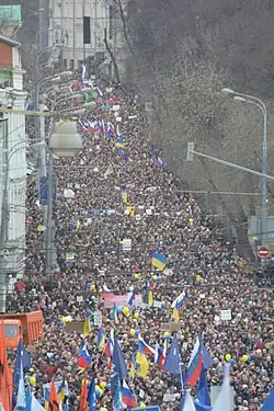In Russland wurden mehrere regierungskritische Internetseiten abgeschaltet, darunter der Blog des Oppositionellen Alexei Nawalny.[132] Nawalnys Blog wurde am 13. März wieder freigeschaltet.[133] Bereits im Dezember 2013 hatte Putin RIA Novosti als eigenständige Nachrichtenagentur aufgelöst und der staatlich gelenkten Rossija Sewodnja unter Dmitri Kisseljow, der als ideologischer Hardliner und als Verfechter präsidialer autokratischer Tendenzen gilt,[134] eingegliedert.[135]