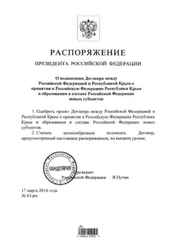 Der russische Präsident Wladimir Putin hielt am 18. März 2014 eine Rede zur Annexion der Krim. Noch am selben Tag unterzeichnete er zusammen mit dem Ministerpräsidenten der Republik Krim Sergei Aksjonow, dem Parlamentsvorsitzenden Wolodymyr Konstantynow sowie dem Vorsitzenden des Koordinationsrates zur Organisation der Stadtverwaltung von Sewastopol, Alexei Tschaly, einen Beitrittsvertrag der Krim zu Russland und kündigte an, es werde zwei neue Föderationssubjekte geben.[180][181][182] Das Presseamt der russischen Regierung teilte hierzu mit, die Krim sei „ab dem heutigen Tag Bestandteil der Russischen Föderation“.[183] In einem Fernsehinterview erklärte der russische Staatschef Putin, einer der Gründe für die Angliederung der Krim sei der Ausbau der militärischen Infrastruktur an den Grenzen Russlands im Zuge der NATO-Osterweiterung. Russland sei vom Schwarzen Meer abgedrängt worden.[184]