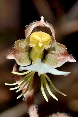 Der endständige, behaarte, traubige Blütenstand trägt einige weiße, meist resupinierte Blüten. Die zwittrigen Blüten sind zygomorph und dreizählig. Die Blütenhüllblätter sind frei, die äußeren drei sind auf der Außenseite behaart und dunkel gefärbt. Die beiden Petalen und das obere Sepal sind schützend über der Säule zusammengeneigt, während die seitlichen Sepalen abgespreizt sind. Die Lippe bildet an ihrer Basis einen sackartigen Sporn, der am Ende zweigeteilt sein kann. Innerhalb des Sporns befinden sich zwei drüsige Anhängsel. Der Mittelteil der Lippe ist schmal und zu einer Röhre eingerollt, so dass die Unterseite der Lippe nach oben weist. Von dieser Unterseite entspringen zahlreiche fadenförmige Anhängsel, die seitwärts weisen. Das Ende der Lippe ist breit und ganzrandig bis zweilappig. Die Säule ist auf der Unterseite mit einem zweireihigen Kallus versehen, auf der Oberseite sitzt das Staubblatt. Es enthält zwei Pollinien, die über Stielchen mit einer Klebeplatte (Viscidium) verbunden sind. Die Narbe besteht aus zwei separaten Flächen, die sich seitlich vorne auf der Unterseite der Säule befinden.