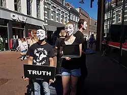 - ↑ a b c d Toby McCasker: 'Cube of truth': Anonymous hit streets with violent footage of animal farming In: The Guardian, 31. Januar 2017. Abgerufen am 29. Januar 2019 (englisch).