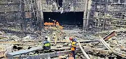 Kurz vor Beginn eines geplanten Konzerts der russischen Rockband Piknik drangen gegen 20 Uhr Ortszeit[12][13][14] mindestens drei Männer – laut der Nachrichtenagentur Interfax waren es zwei bis fünf Angreifer[15] – in Tarnkleidung und unmaskiert in die mit 6.200 Karten[16] fast ausverkaufte Halle ein und schossen mit automatischen Schusswaffen auf Anwesende. Zusätzlich wurde mit Benzin ein Brand entfacht.[17] Danach entfernten sie sich vom Tatort. Das Gebäude mit der Konzerthalle auf 13.000 Quadratmetern stand in Flammen.[18] Eine Stunde nach Ende der Attacke war die SOBR Spezialeinheit noch nicht ins Gebäude eingedrungen.[19] Gemäß Einsatzrichtlinien betraten die Rettungskräfte nicht vor den Sicherheitskräften das Gebäude. Der Brand wurde zwar danach gestoppt, dennoch stürzten Teile des Daches ein.[20][21] Leonid Gosman erwähnte mehr Tote durch den Brand als durch Schüsse.[22] Die Zahl der Todesopfer erhöhte sich laut dem staatlichen Ermittlungskomitee in den folgenden Tagen auf mindestens 144, darunter drei Kinder. Bis Ende März 2024 wurden 360 Verletzte gezählt, davon mussten 155 in Krankenhäusern behandelt werden.[23][24][25][26] Die Todesopfer waren die Folge von Schussverletzungen oder Rauchgasvergiftung.[27] Im Jahr 2025 wurde seitens Tagesschau von 600 Verletzten berichtet.[28]