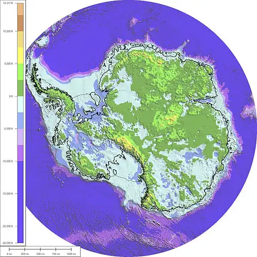 Das Süßwasser-Eis Antarktikas bildet den Großteil der „Land“oberfläche und wird daher zum Kontinent gerechnet. Große Teile von Antarktika liegen unter Meeresspiegelniveau, sind jedoch bis über Meeresspiegelniveau von Eis bedeckt und werden üblicherweise als Teil des Kontinents angesehen.