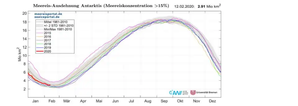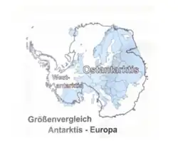 Die Gesamtfläche der Antarktis beträgt rund 14 Millionen km². In Abbildung 1 wird die Größe der Antarktis in einer Tabelle anhand von einer Karte aus dem Jahr 2001 (Bedmap1) und einer Karte aus 2013 (Bedmap2) verglichen. Die Bedmap1 ist eine topografische Karte des küstennahen Meeresbodens und des Gestein-Untergrunds der antarktischen Eisschilde, die 2001 von der British Antarctic Survey (BAS) veröffentlicht wurde. Aus den Daten der Bedmap1 wurde 2013 die Bedmap2 von Peter Fretwell und seinem Koautoren-Team erstellt. Diese zeigt die Oberflächenhöhe, Eisdicke sowie die Höhe des Meeresbodens und des subglazialen Bodens. Abbildung 1.1 zeigt die im Jahr 2013 veröffentlichte Bedmap2.[7] Bei der Flächenbetrachtung ist zu beachten, dass die Fläche durch einen festen, bis zu 1000 km dicken, im antarktischen Winter entstehenden Eisgürtel (bestehend aus Packeis) deutlich an Masse zunimmt.[8] Die mengenmäßige Ausdehnung des Meereises im Winter der Antarktis (von März bis September) sowie dessen Abnahme im Sommer (von September bis März) kann in Abbildung 2 von den Jahren 1981 bis 2020 beobachtet werden. Die Menge ist in Millionen km² angegeben. Flächenmäßig ist der Kontinent der Antarktis somit anderthalb so groß wie Europa und hält in seinem „Eispaket“ drei Viertel der gesamten Süßwasservorräte der Welt fest.[2] Der Größenunterschied ist in Abbildung 3 deutlich zu erkennen.