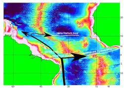 Im Guiana-Becken, westlich von 40°W, könnte die Topographie und der starke ostwärts fließende Deep Western Boundary Current das antarktische Bodenwasser von einem Abfluss nach Westen abhalten; so wird es am Osthang des Ceará-Rückens weiter nach Norden geführt. Nördlich des Ceará-Rückens, bei 44°W, fließt das Wasser wieder nach Westen ins Zentrum des Beckens.[9]