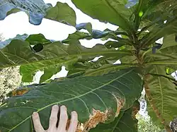 Bei den gegenständig angeordneten Laubblätter können die eines Paares gleich sein oder verschieden. Die Laubblätter besitzen einen Blattstiel oder sind sitzend. Bei den sitzenden Laubblättern sind die Spreitenbasis oder die Blattstiele geöhrt. Die oft relativ großen (bis zu 2,5 Meter), aber bei den Lianen kleineren[2], einfachen, weichen und vergänglichen oder ledrigen Blattspreiten sind, wenn sie trocken sind, oft häutig, papierartig und spröde oder ledrig. Die glatten oder winzig gekerbten Blattränder können zurückgebogen sein. Die Seitennerven können deutlich erkennbar sein. Es sind intrapetiolare Nebenblätter vorhanden.[1]