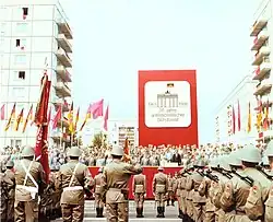 In der Öffentlichkeit der DDR übernahm die SED die vollständige Kontrolle über bildliche Darstellungen der Grenzbefestigungen in Berlin. Zugleich mussten die erlaubten Abbildungen der Grenzanlagen in Berlin in Zusammenhang mit dem Brandenburger Tor stehen. Einzig die Fotos aus einer am 14. August 1961 dort entstandenen Serie der Nachrichtenagentur ADN waren zur Dokumentation der Absperrmaßnahmen zugelassen. Ein Foto, das vier bewaffnete Angehörige der Kampfgruppen der Arbeiterklasse mit dem Tor im Rücken und kampfentschlossenem Blick nach Westen zeigte, wurde zu einer Medienikone der DDR. Das Tor wurde bei Paraden und auf Briefmarken zum Logo der Mauer.[13]
