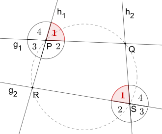 Die Bedingung für die Schnittwinkel in der Eingangsdefinition ist äquivalent dazu, dass die vier Schnittpunkte auf einem gemeinsamen Kreis liegen, also ein Sehnenviereck bilden.[3]