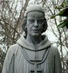 - Hinweistafel an der Statue für Pater Mégret in Abbeville