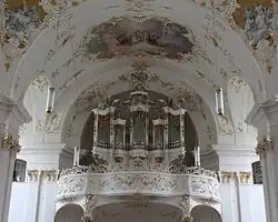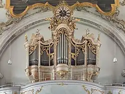 II/P | 18 | Prospekt mit Engelskonzert von Christian Jorhan d. Ä.[6] 1895 Neubau von Binder und Siemann im historischen Gehäuse von 1783 1985 Neubau von Manfred Mathis im historischen Gehäuse von 1783 → Orgel |