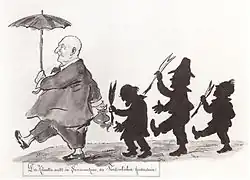 Karikatur von Otto Böhler auf Bruckner und seine Kritiker (Eduard Hanslick, Max Kalbeck und Richard Heuberger), in Anlehnung an den Struwwelpeter
