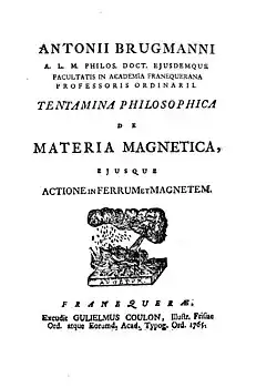 - Antonii Brugmans Magnetismus, seu, De affinitatibus magneticis observationes academicæ. Van Damme, Leiden 1778. (Digitalisat)