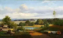 - Partie bei Ermelunden mit Blick auf die Kirche von Getoften, Schloss Bernstorff und Kopenhagen, Öl auf Leinwand, 42 × 69 cm.