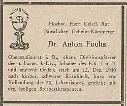 „Feldgeistlicher Dr. Anton Foohs ist ein vorbildlicher Feldseelsorger, der weit über seine Pflicht hinaus seines Amtes waltet und bei allen Gefechten unerschrocken das Sperrfeuer durchbricht um in vorderster Linie den Verwundeten beizustehen und den Kämpfenden zuzusprechen. Obwohl seine Leistungen das Pflichtgemäße erheblich übersteigen, ist er still und bescheiden und hat nie am Morgen davon gesprochen, daß er in der Kampfnacht in vorderster Linie war. Ein liebenswürdiger, feiner, stets heiterer Gesellschafter, im Stabe sehr beliebt.... Pfarrer Dr. Foohs hat die ihm zuerkannten Eigenschaften in den großen Abwehrschlachten von Arras, Loos, an der Somme und in Flandern bestätigt. Sein Eisernes Kreuz I. Klasse ziert ein echtes Soldatenherz im Priesterkleid.... Unvergesslich wird es der Division bleiben, wie Dr. Foohs am 9.6.1918 beim Sturm auf den Thiescourt-Wald, 12 Stunden in den vordersten Reihen weilte... sein Amt erfüllend.“