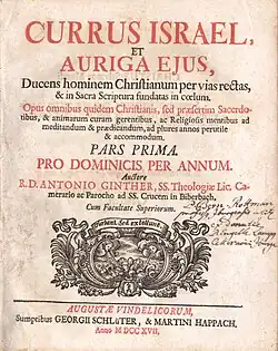 - Anton Ginther: Currus Israel, et auriga ejus, ducens hominem Christianum per vias rectas, & in sacra scriptura fundatas in coelum. Martin Happach & Consort., Augsburg 1735, ed. 6 bei Google Book Search