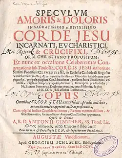 - Speculum amoris et doloris in saratissime ac divinissio corde Jesu incarnati, eucharistici et crucifixi. Lotter, Augsburg 1731 ; 4. Edition 1743 (Digitalisat)