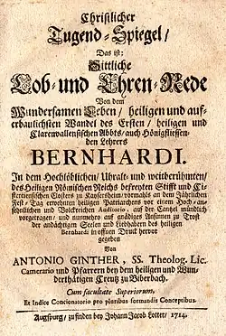 - Christlicher Tugendspiegel. Das ist, Sittliche Lob- und Ehren-Rede Von dem Wundersamen Leben, heiligen und auferbaulichsten Wandel deß Ersten, Heiligen und Clarenvallensischen Abbts auch Hönigflüssenden Lehrers Bernhardi... Lotter, Augsburg 1707
