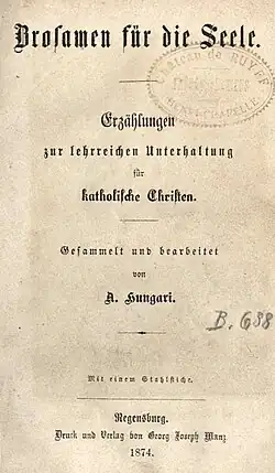 - ↑ Zeitgenössische Werbeanzeige für Hungaris Sammelwerk Katholische Volksbibliothek