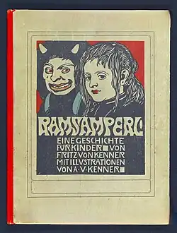 Zwei Kindergeschichten, Cover-Entwurf, 1908 Tusche, Deckfarbe auf Karton, 30 × 23 cm, Kunstsammlung und Archiv, Universität für angewandte Kunst Wien, Inv. Nr. 10.812. -