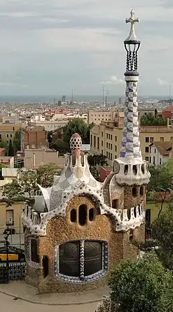 Gaudí war bekannt für seinen eigenwilligen Stil von welligen, organisch wirkenden Formen. Er errichtete seine Bauwerke in der Formsprache des Modernisme, der katalanischen Spielart des Jugendstils. Die typischen Merkmale waren geschwungene Linien, unregelmäßige Grundrisse, schräg gemauerte Stützen, naturnahe weiche Formen mit Motiven der Flora und Fauna. Weitere Vorlieben waren Bruchsteine und bunte Keramikfliesen, die er als Gestaltungselement in seinen Bauwerken verwenden ließ. Gaudí lehnte die gotischen Strebebögen verächtlich als „Krücken“ ab und benutzte stattdessen schräge Baupfeiler. Er entwickelte seine Gebäude während des Baus anhand von Skizzen und Modellen. Da Gaudí ein Gebäude als Gesamtkunstwerk empfand, entwarf er auch die kleinsten Details im Gebäudeinneren selbst.[6] Seine Entwürfe führten die Schmiede- und Mosaikkunst, die Tischlerei und die Glaskunst zu neuen Höhepunkten. Seine Stilelemente beeindrucken mit schlichten, aber originellen, vielfach organischen Formen.