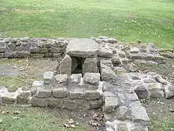 - ↑ CIL 7, 1088 = Roman Inscriptions in Britain 2139: Imp(eratori) Caes(ari) Tito Aelio / Hadri(ano) Antonino / Aug(usto) Pio p(atri) p(atriae) leg(io) II / Aug(usta) per m(ilia) p(assuum) IIIIDCLII / fec(it). Deutsch: „Für den Imperator Caesar Titus Aelius Hadrianus Antoninus Augustus Pius, Vater des Vaterlandes, hat die zweite Legion Augusta [dieses Bauwerk] auf [einer Strecke von] 4652 Schritten geschaffen.“