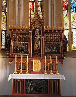 Der neugotische Hochaltar des Würzburger Kunstschreiners Ludwig Link kam mit der Renovierung des 19. Jahrhunderts in die Kapelle und ersetzte einen barocken Altar. Älteste Elemente des Retabels sind die zwei spätgotischen Reliefs des 16. Jahrhunderts, die bemalt in den Altar eingefügt wurden. Die künstlerische Ausgestaltung übernahm der Würzburger Karl Behrens, der die Muttergottesfigur im Zentrum des Altars fertigte. Der Altar wird von den Figuren des heiligen Antonius mit einem Schwein und des heiligen Benedikt mit einem Raben eingerahmt. Weiter innen befinden sich zwei Reliefs, das linke, die Anbetung der Könige ist neugotischen Ursprungs, die Grablegung Christi wurde um das Jahr 1520 geschaffen und weist Ähnlichkeiten zu den Werken Riemenschneiders auf. Es ist 80 auf 35 cm groß und zeigt den Leichnam Christi, der von Maria, Johannes Evangelist, Maria Magdalena und Josef von Arimathäa ins Grab gelegt wird. Der reich mit neugotischem Schmuck verzierte Altar läuft nach oben hin in drei Fialen aus. Das Allerheiligste befindet sich in einem zinnenbewehrten, rotgefassten Tabernakel. Das spätgotische Relief am Antependium, die Bestattung des Einsiedlers Paulus, misst 87 × 57 cm und zeigt den toten Paulus von Theben, wie er von Antonius, dem Einsiedler, begraben wird.[6] Zwei Löwen flankieren die Szene. Beide Reliefs wurden wohl erst nachträglich bunt gefasst.