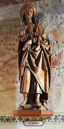 Auf der linken Seite des Apsisbogens, unterhalb des Freskenzyklus, befindet sich die Figur des heiligen Jakobus des Älteren. Dargestellt ist Jakobus als alter Mann, der in ein Pilgergewand gekleidet ist. Die Heiligenfigur ist 145 cm hoch und besteht aus Lindenholz. Jakobus trägt den typischen Wallfahrerhut, sein Mantel reicht bis zum Boden. Mit seiner linken Hand zieht er den Mantel zu, die rechte befindet sich an der im Gewand verborgenen Pilgertasche.