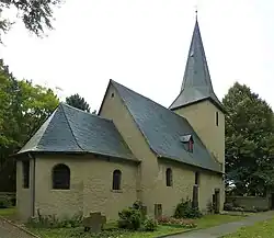 Der dreigeschossige Turm hat einen achtseitigen, schiefergedeckten Helm, der von einem Antoniuskreuz bekrönt wird. Das Obergeschoss mit dem Glockenstuhl hat in der Nord-West- und Südseite je ein Rundbogenfenster, im Mittelgeschoss sind an der Südseite zwei hohe Rundbogenblenden, gegenüber an der Nordwand, befinden sich zwei etwa 20 cm breite und ca. 80 cm hohe Schlitze. Die Westwand des Erdgeschosses hat ein kleines Rechteckfenster, in der Südwand steht ein hohes Rundbogenfenster. Das Langhaus hat ein beschiefertes, steiles Satteldach, das an der Nordseite eine Dachgaube hat. Ein relativ großer, schmaler Chor ist nach Osten vorgesetzt, an dessen Südseite eine Sakristei angebaut ist, deren Zugangstür wegen der Einbruchgefahr 1980 vermauert wurde.