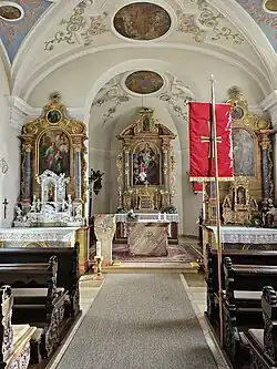 Auf der Mensa des linken Seitenaltars befindet sich ein Fayencealtar, der 1773/74 in der Schrezheimer Fayencemanufaktur geschaffen wurde. Das Modell stammt von Johann Martin Mutschele (Bamberg). Das in seiner Art einzigartige Fayencealtärchen, eine Höchstleistung der Manufaktur, ist ein Kunstwerk von europäischem Rang. Die reich gegliederte Tabernakelbasis stellt das letzte Abendmahl in Purpurfarbe dar und wird mit einem baldachinartigen Aufbau begrenzt. In der Nische steht eine farbig gefasste Holzplastik der Madonna, die eine Nachbildung der Madonna in der Wallfahrtskirche Neukirchen beim Heiligen Blut im Bayerischen Wald darstellt. Üppiger Rokokozierrat mit stehenden und schwebenden Putten, geflügelten Engelsköpfen, Voluten und Rocaillen rundet das Kunstwerk ab.