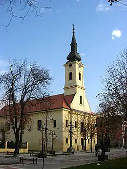 Im Großen Türkenkrieg kam Apatin um 1690 zur Habsburgermonarchie. Die Ortschaft wurde zunächst von serbischen Flüchtlingen südlich der Donau neu besiedelt und Buksinovacz genannt.[1] 1739 wurde Apatin dann an der Stelle des alten Prädiums Opati (oder Opaty) als sogenannter „Schüttkasten“ (Brückenkopf mit Proviantstation) von der Wiener Hofkammer an der damaligen Endstation der Ulmer Schachteln gegründet und mit deutschen Wachsoldaten aus dem nahe gelegenen Esseg besiedelt, während die serbischen Einwohner nach Stapar bei Sombor umgesiedelt wurden. 1748 wurde die erste römisch-katholische Kirche („Maria Himmelfahrt“) gebaut, anschließend erfolgte die Ansiedlung von Donauschwaben. Apatin ist eine frühtheresianische Kameralsiedlung, die in zwei Phasen ausgebaut wurde. Sie sind im Grundriss zu erkennen. Der Südosten gehört zur ersten Phase der Gründung von 1750 bis 1753. Dieser Teil ist unregelmäßiger konstruiert als der nördliche, welcher die Ansicht einer geometrischen Schachbrettform bietet. Ihre Anlage wird in die Zeit von 1764 bis 1766 datiert. Zwar entbehrt der Gesamteindruck einer konsequenten Bauvorlage, es zeichnet sich jedoch die planmäßige Anlage des neuen Baustils bereits deutlich ab.[2]