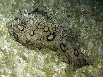 Die Grundfarbe der Tiere reicht von fast farblos beige bis kräftig sandbraun, von hellgrau über grün bis zu dunkelbraun. Charakteristische Oberflächenmuster sind große schwarze Ringe, die ihr ein leopardenähnliches Aussehen verleihen. Auffällig sind bei einigen Exemplaren an den Rändern der Parapodiallappen beginnende schwarze, netzwerkartig angeordnete Fadenlinien. Wieder andere Exemplare haben Parapodiallappen mit einem hellweiß gefärbten Saumstreifen.