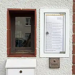 Notdienstfenster an einer Apotheke mit Nachtglocke und Aushang der diensthabenden Apotheken