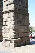 Die Pfeiler wurden in einer Art Gusstechnik errichtet, bei der eine in die Höhe wachsende Mauerschale aus Granit mit einer Mischung aus kleinen Geröllsteinen und Mörtel (opus caementitium) gefüllt wurde. Das vollkommen gleichmäßige Mauerwerk lässt darauf schließen, dass die Steine bereits im Steinbruch auf die vorgegebenen Maße zugehauen wurden und an Ort und Stelle ohne größere Nachbearbeitung versetzt werden konnten.