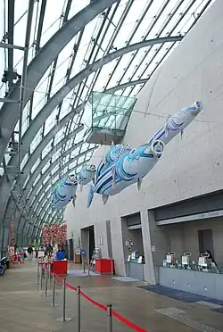 - Am Ende des Rundgangs befinden sich im Erdgeschoss mit dem „Aquamarine Ei“ und dem „Kinder-Biotop“ Informationsstände und Spielanlagen speziell für Kinder. Es gibt auch einen nach oben offenen Touch Pool, wo ausgewählte Fische berührt werden dürfen. Außerdem besteht für Besucher die Möglichkeit, Speisefische zu angeln, die anschließend zubereitet und verspeist werden können.[6]