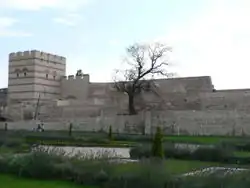 Nach seinem Sieg im Bürgerkrieg startete Muʿāwiya eine Reihe von Angriffen gegen die byzantinischen Besitzungen in Afrika, Sizilien und im Osten.[27] Um 670 war die muslimische Flotte in das Marmarameer vorgedrungen und überwinterte in Cyzicus. Vier Jahre später tauchte erneut eine gewaltige muslimische Flotte im Marmarameer auf und errichtete erneut einen Stützpunkt in Cyzicus, von wo aus sie die byzantinischen Küsten fast nach Belieben überfielen. Schließlich schickte Muʿāwiya 676 ein Heer aus, um Konstantinopel auch vom Land aus zu belagern, womit die erste arabische Belagerung der Stadt begann. Konstantin IV. (reg. 661–685) setzte jedoch eine verheerende neue Waffe ein, die unter dem Namen „Griechisches Feuer“ bekannt wurde und von einem christlichen Flüchtling aus Syrien namens Kallinikos von Heliopolis erfunden worden war, um die angreifende Flotte der Umayyaden im Marmarameer entscheidend zu besiegen, was zum Ende der Belagerung im Jahr 678 führte. Die zurückkehrende muslimische Flotte erlitt weitere Verluste durch Stürme, während die Armee viele Männer an die byzantinischen Heere verlor, die sie auf ihrem Rückweg angriffen.[28] Unter den bei der Belagerung Getöteten befand sich auch Abū Ayyūb al-Ansārī, der Bannerträger Mohammeds und der letzte seiner Gefährten; für Muslime gilt sein Grab heute als eine der heiligsten Stätten in Istanbul.