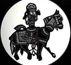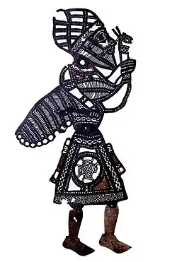Die osmanischen Figuren des 18./19. Jahrhunderts sind etwa 30 Zentimeter,[55] die älteren ägyptischen Figuren über 60 Zentimeter bis zu halber Lebensgröße hoch.[56] Sie sind aus schwarz gefärbter dicker Tierhaut ausgeschnitten und mit gestrichelten Linien und geometrischen Mustern dekoriert. Bei manchen wertvollen Figuren sind einige ausgeschnittene Flächen mit einer dünneren, bemalten Haut hinterlegt, um durchscheinende, farbige Stellen zu erzeugen. Da die dünnen, farbigen Stellen wesentlich empfindlicher sind, gingen sie bei älteren Figuren häufig verloren. Um 1900 wurden die Figuren mit etwa einem Meter langen Spielstäben (aus den Rippen von Palmblättern) an den Vorhang gehalten. Mit der Spitze stecken die Stäbe in kreisrunden Löchern, die durch beidseitig aufgenähte Lederstücke verstärkt sind, in den Figuren. Sie sind damit in alle Richtungen beweglich. Eine sehr große Figur oder eine Figur mit beweglichen Teilen braucht zwei Löcher zum Fixieren. Bewegliche Teile werden durch Fäden zusammengebunden.[57]