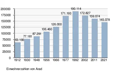 Eine großangelegte Ansiedlungspolitik führte zu einer spektakulären demografischen Entwicklung der Stadt im 19. Jahrhundert. 1804 hatte Arad 8.476 Einwohner, 1850 waren es 22.398 Einwohner, 1900 stieg die Anzahl auf 56.260 Einwohner. 1930 wuchs die Einwohnerzahl der Stadt durch die Einverleibung der benachbarten Dörfer sowie durch gezielte Zuwanderung aus anderen Landesteilen auf 77.181. In den 1970er Jahren stieg die Bevölkerungszahl als Folge der industriellen Entwicklung, des Zuzugs aus anderen Landesteilen und des Abtreibungsverbots (Vier-Kinder-Politik) des Diktators Nicolae Ceaușescu auf 171.193 Einwohner. 1990 erreichte die Einwohnerzahl Arads ihren Höhepunkt von 190.114. Seit 1990 ist die Bevölkerungszahl wegen des Geburtenrückgangs und der Abwanderung ins ländliche Umland, aber auch ins Ausland, stetig im Sinken begriffen. 2002 betrug die Einwohnerzahl 172.827.[11]