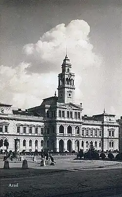 Am 25. Oktober 1858 fuhr der erste Zug im Arader Bahnhof aus Richtung Curtici ein.[23] Am 22. Dezember 1868 wurde die Strecke nach Deva eröffnet, zwei Jahre später die Strecke Arad–Timișoara. Sie war Teil der historischen Route des Orient-Express, der bis 1889 nach Warna fuhr und dort verschifft wurde. Das heutige Empfangsgebäude wurde 1898 errichtet.