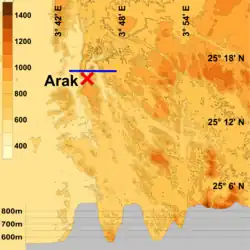 Die Arak-Schlucht gehört zu den faszinierendsten Gebirgsformationen der algerischen Sahara. Sie liegt etwa 270 km südöstlich von In Salah, bevor das 400 km südlich gelegene Tamanrasset am Südrand der Teffedest-Berge erreicht wird.