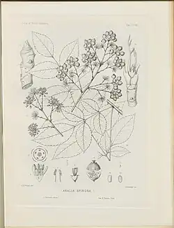 - ↑ a b c d Aralia spinosa im Germplasm Resources Information Network (GRIN), USDA, ARS, National Genetic Resources Program. National Germplasm Resources Laboratory, Beltsville, Maryland. Abgerufen am 13. Januar 2014.